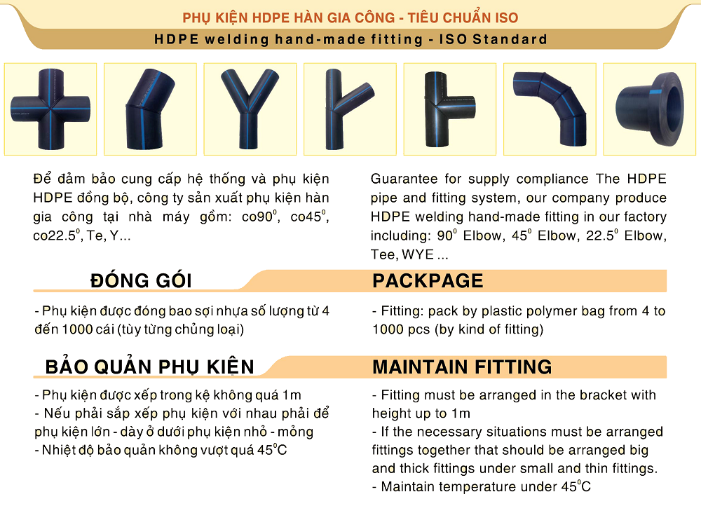 Để đảm bảo cung cấp hệ thống và phụ kiện HDPE Đệ Nhất đồng bộ, công ty sản xuất phụ kiện HDPE hàn gia công tại nhà máy gồm: co 90, co 45, co 22.5, tê, Y,…